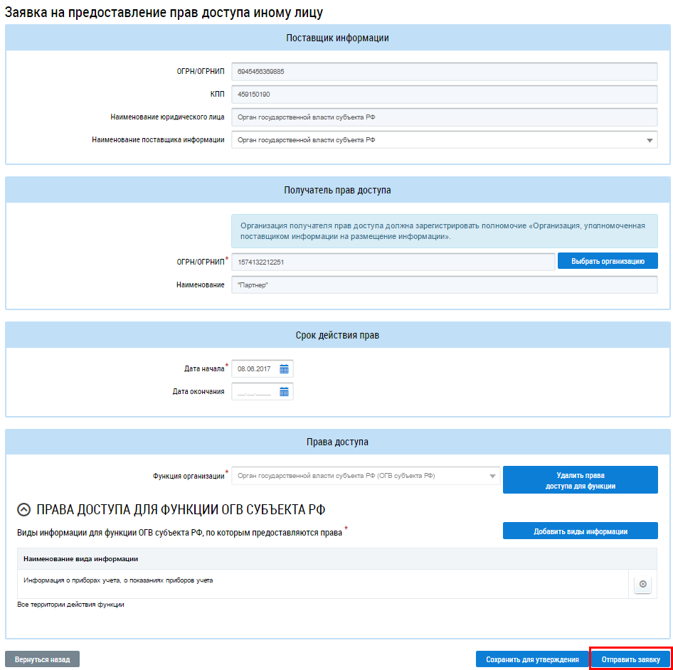 Для отправки заявки получателю прав нажмите на кнопку Отправить заявку (доступно для руководителей организации).