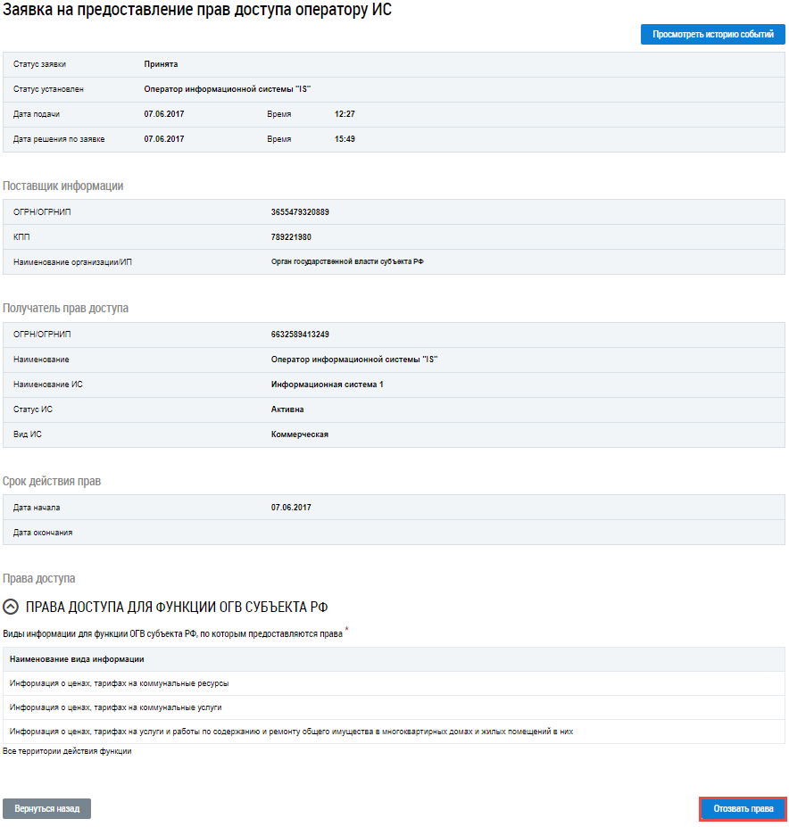 Операция отзыва прав доступа доступна для заявок в статусе Принята.