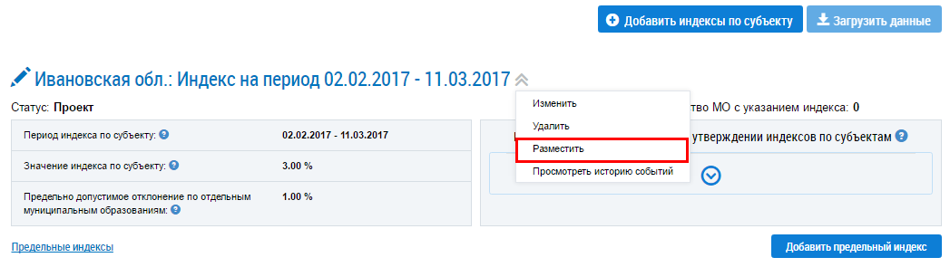 Для размещения индексов нажмите на кнопку Разместить информацию на странице добавления индекса по субъекту или выберите пункт контекстного меню Разместить.