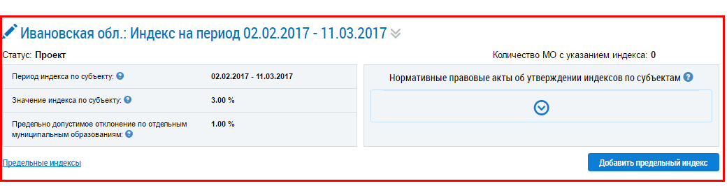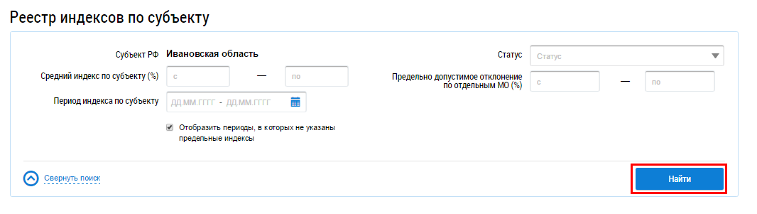 При необходимости воспользуйтесь блоком поиска. Введите требуемые параметры, установите флажок Отобразить периоды, в которых не указаны предельные индексы и нажмите на кнопку Найти.