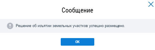 Отображается информационное сообщение об успешном размещении информации о решении об изъятии земельных участков.