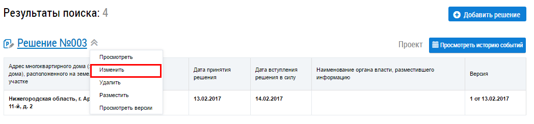 Для изменения информации о решении об изъятии земельных участков выберите пункт контекстного меню Изменить.