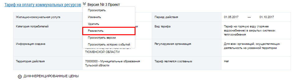 Для размещения тарифа на оплату коммунальных ресурсов выберите пункт контекстного меню Разместить.