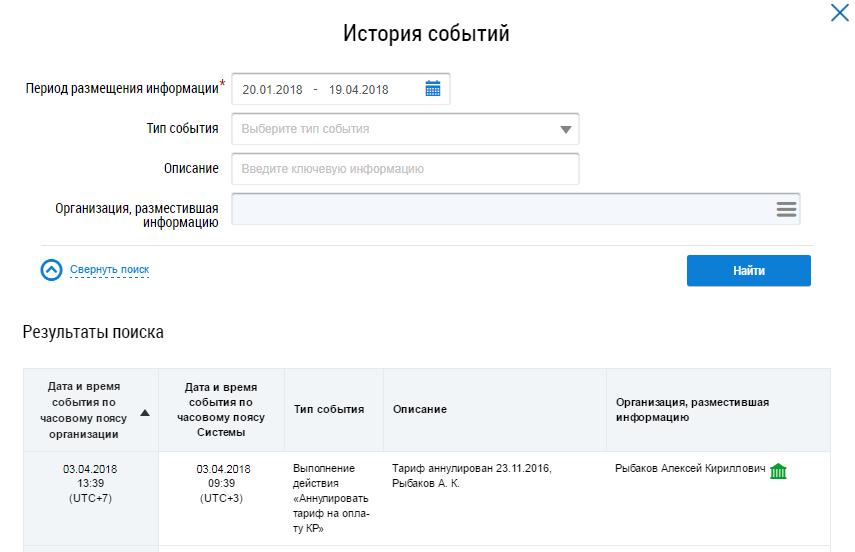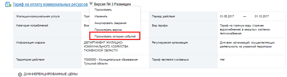Для просмотра версий тарифа выберите пункт контекстного меню Просмотреть историю событий.