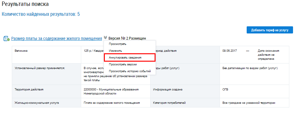 Для аннулирования сведений о тарифе выберите пункт контекстного меню Разместить.