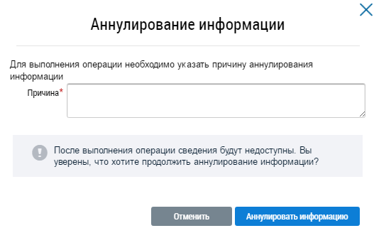 Напишите причину аннулирования информации и нажмите на кнопку Аннулировать информацию.