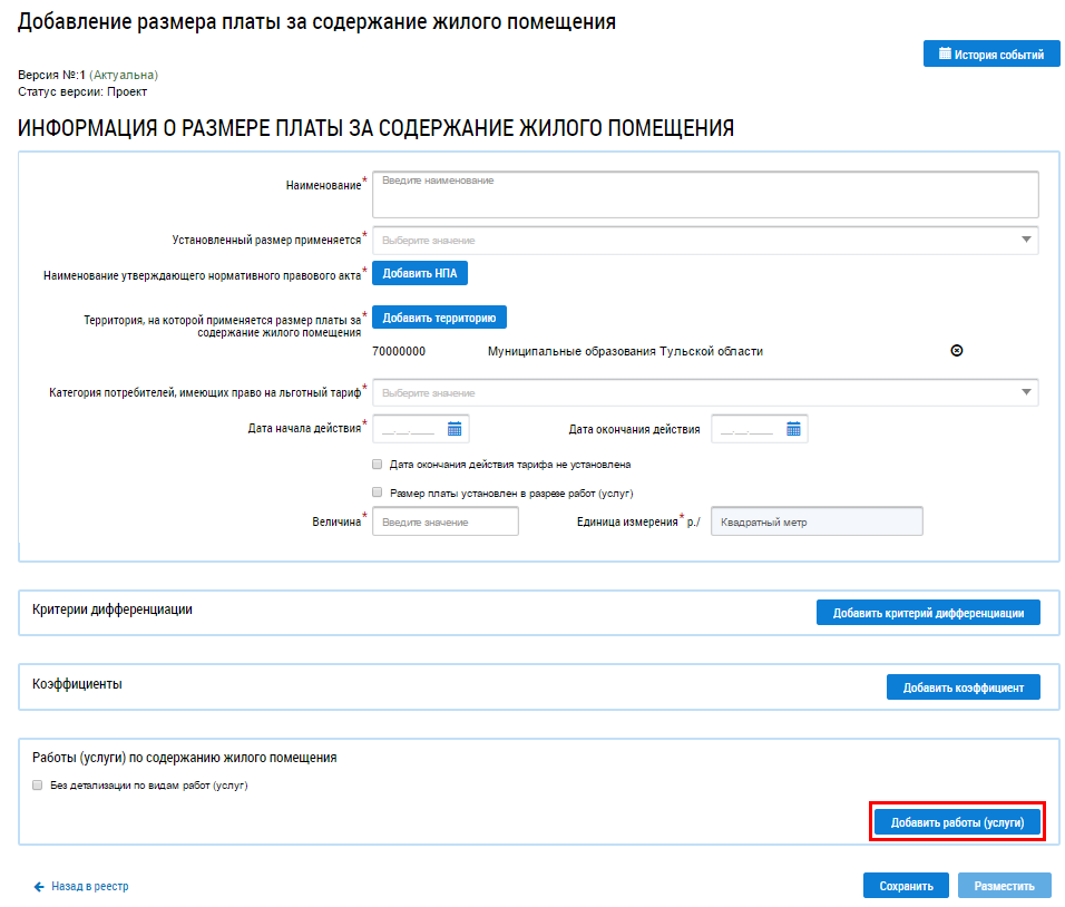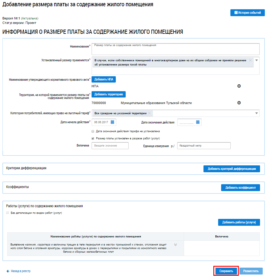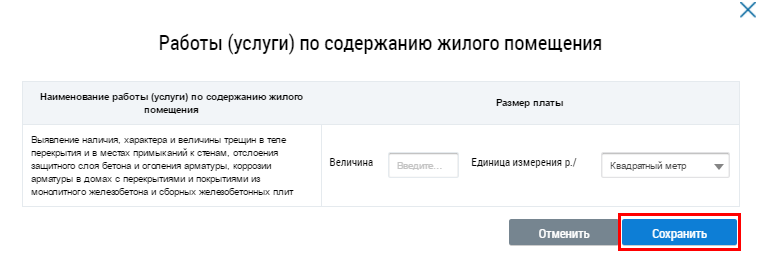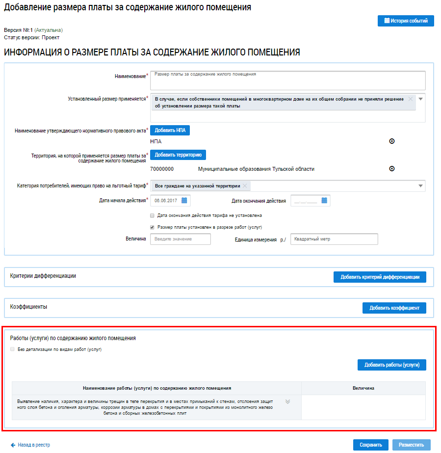 Работы (услуги) отображаются на странице Добавление размера платы за содержание жилого помещения.