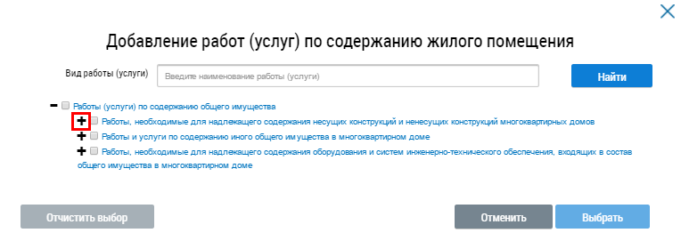 В отобразившемся окне Добавление работ (услуг) по содержанию жилого помещения при необходимости воспользуйтесь блоком поиска.