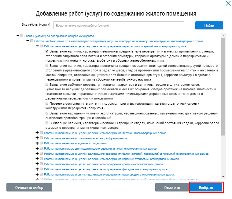 Затем установите флажок у необходимой работы (услуги) и нажмите на кнопку Выбрать.