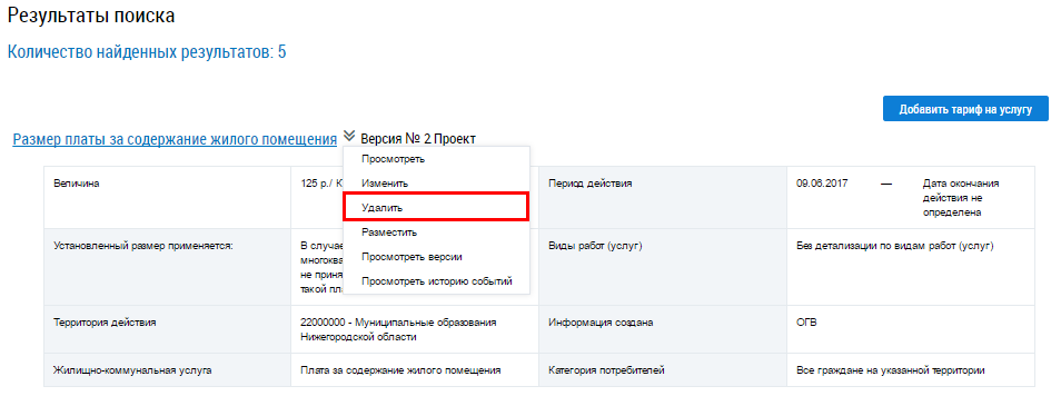 Для удаления тарифа выберите пункт контекстного меню Удалить.