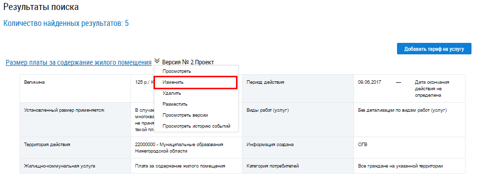 Для изменения тарифа выберите пункт контекстного меню Изменить.