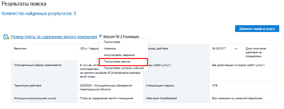 Просмотр версий размера платы за пользование жилым помещением
