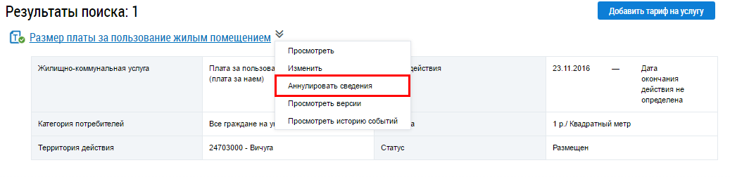 Для аннулирования сведений о тарифе выберите пункт контекстного меню Аннулировать сведения.