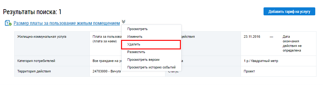 Для удаления тарифа выберите пункт контекстного меню Удалить.