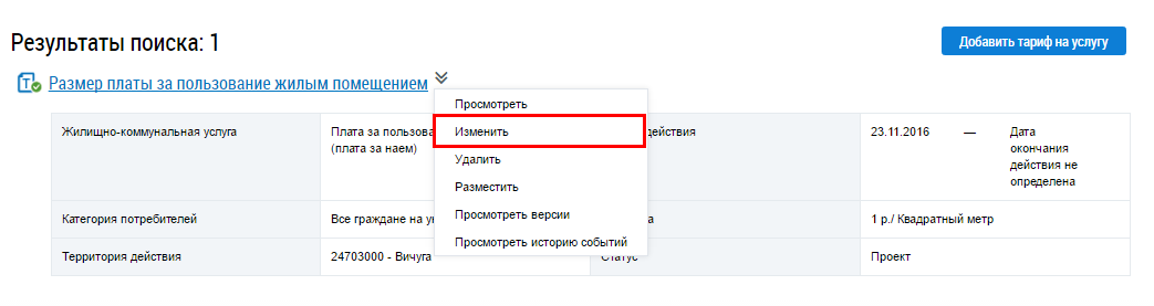 Для изменения тарифа выберите пункт контекстного меню Изменить.
