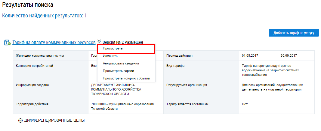 Для просмотра льготных тарифов на жилищно-коммунальные услуги выберите пункт контекстного меню Просмотреть или нажмите на гиперссылку с наименованием тарифа.