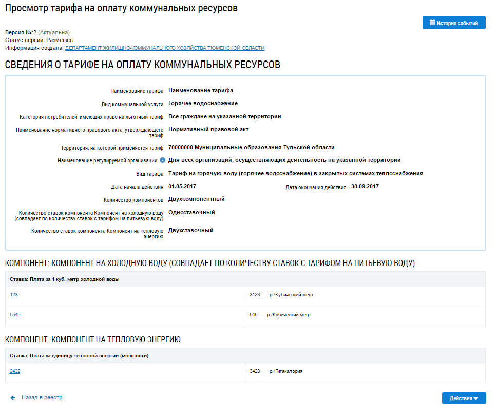 Отображается страница Просмотр тарифа на оплату коммунальных ресурсов.