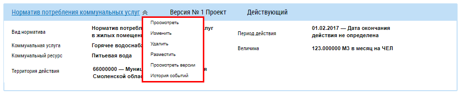 Для размещения информации о нормативе потребления коммунальных услуг раскройте контекстное меню и выберите пункт Разместить.