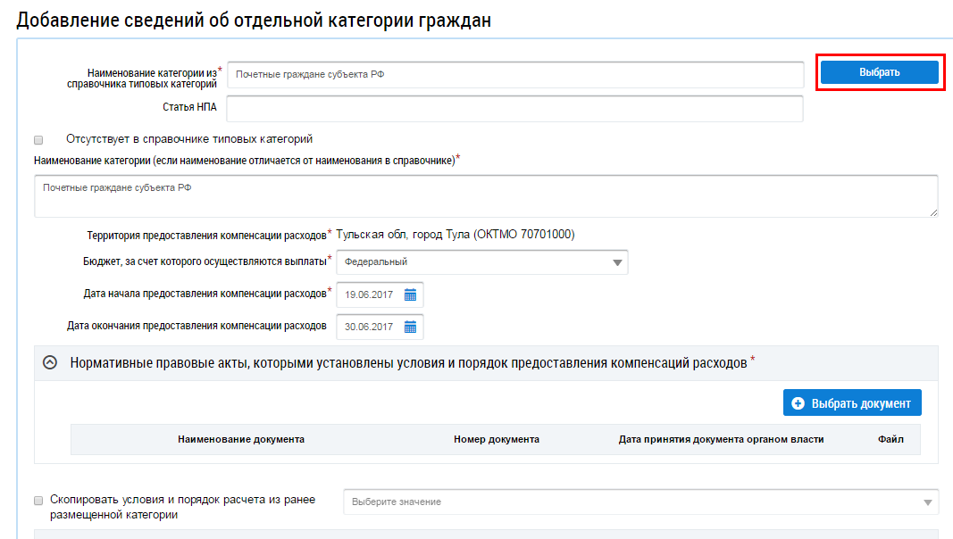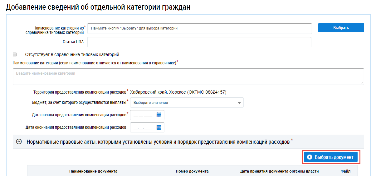 Выберите нормативные правовые акты, устанавливающие категорию граждан, нажав на кнопку Выбрать документ.