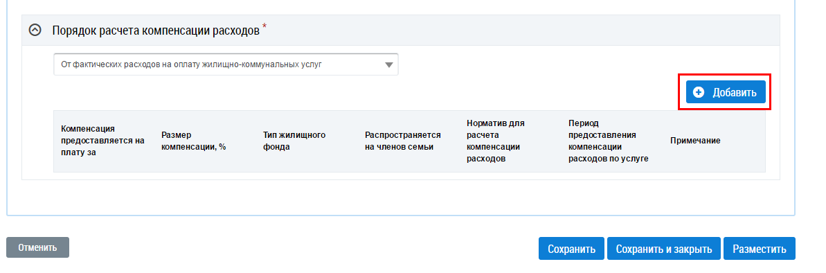 Для добавления отдельной категории граждан нажмите на кнопку Добавить на странице Компенсации расходов на оплату жилых помещений и коммунальных услуг отдельным категориям граждан.