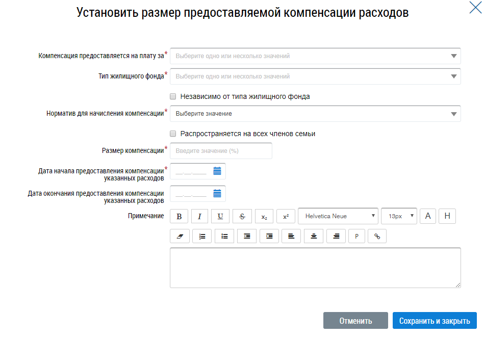 Заполните обязательные поля. Для заполнения полей Компенсация предоставляется на оплату за, Тип жилищного фонда выберите одно или несколько значений из выпадающих списков.