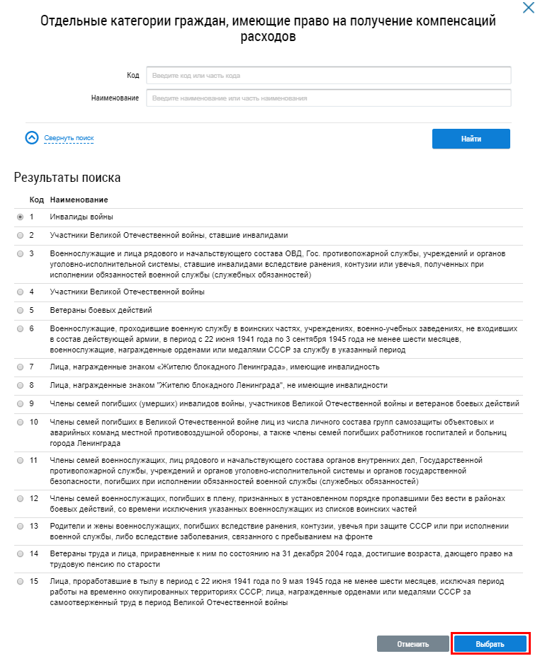 При необходимости воспользуйтесь блоком поиска. Установите переключатель около наименования категории граждан и нажмите на кнопку Выбрать.