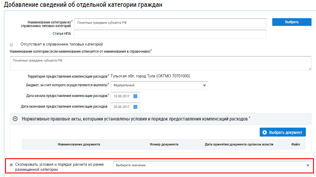 При необходимости копирования сведений об условиях предоставления и порядка расчета компенсации из уже ранее размещенной категории, следует установить флажок в поле Скопировать условия и порядок расчета из ранее размещенной категории и выбрать категорию.