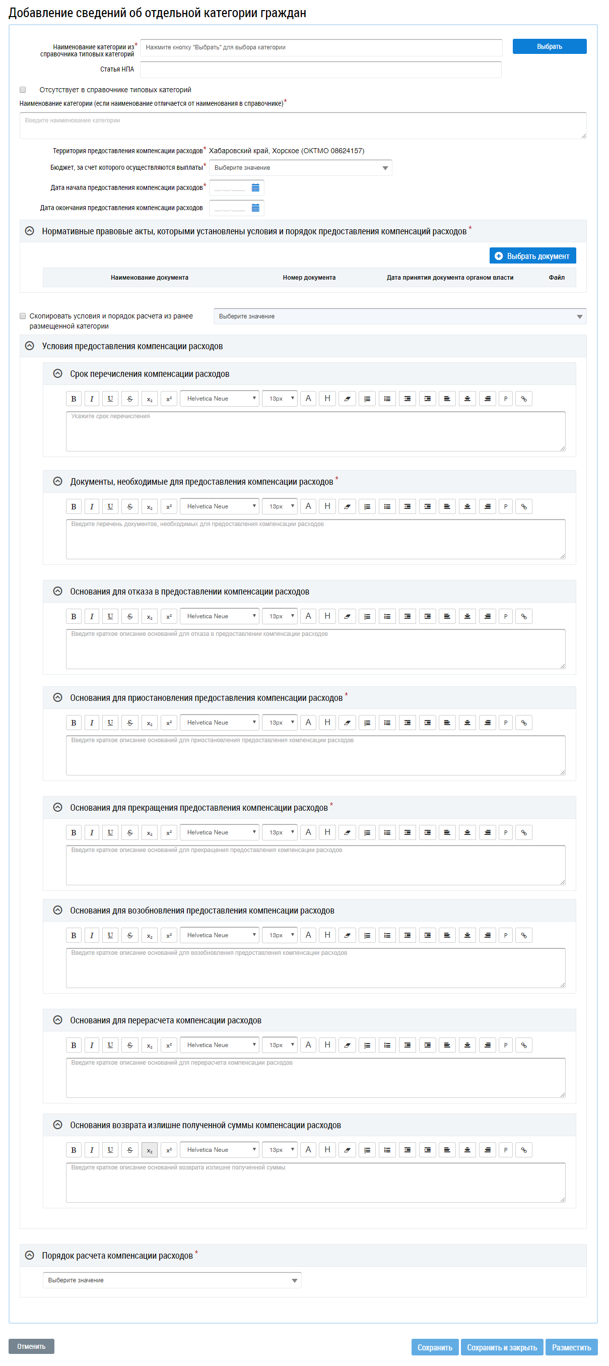 После установки флажка и выбора категории все поля в блоках Условия предоставления компенсаций расходов и Порядок расчета компенсации расходов заполняются аналогично выбранной категории, при необходимости можно их изменить.