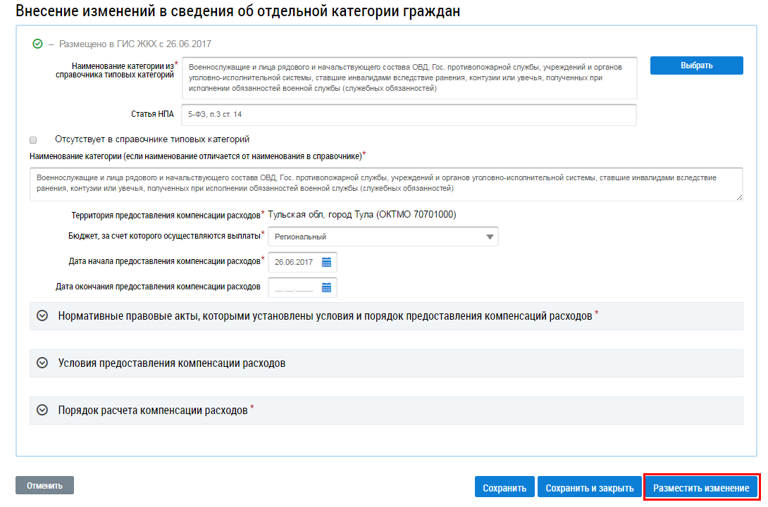 На отобразившейся странице Внесение изменения в сведения об отдельной категории граждан внесите изменения и нажмите на кнопку Разместить изменение.
