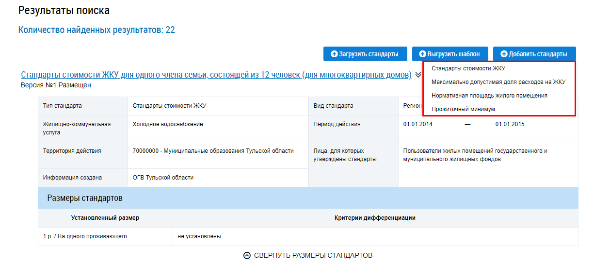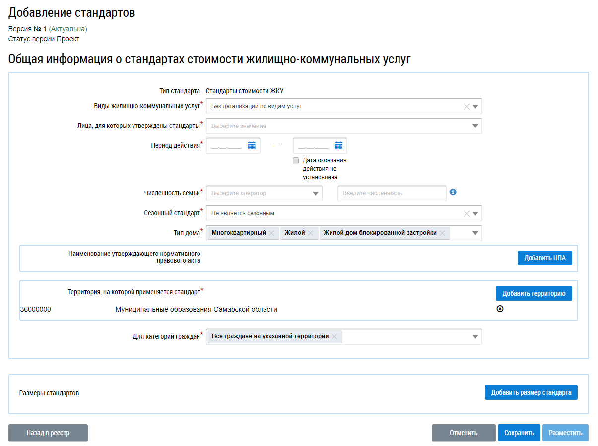 Далее описаны действия в случае выбора вида стандарта Стандарты стоимости ЖКУ.