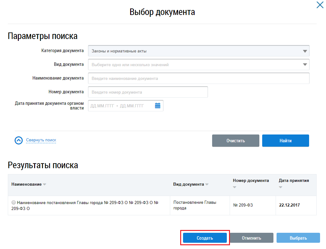 В случае отсутствия нормативного правового акта нажмите на кнопку Создать. Отображается окно Добавление документа.