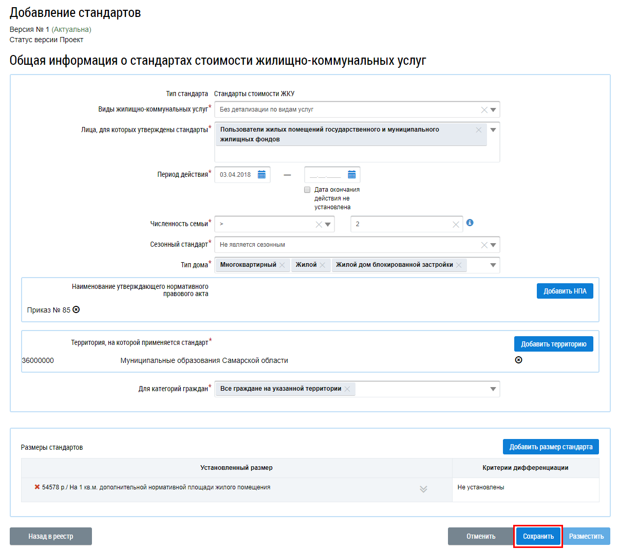После заполнения обязательных полей на странице Добавление стандартов нажмите на кнопку Сохранить.