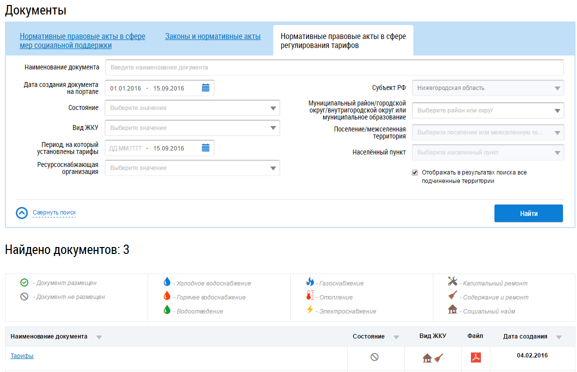 Для перехода к перечню нормативных правовых актов в сфере регулирования тарифов на ЖКУ в разделе горизонтального навигационного меню Дополнительная информация, выберите пункт Тарифы ЖКУ, в выпадающем списке выберите подпункт Нормативные правовые акты в сфере регулирования тарифов на ЖКУ (Раздел меню «Дополнительная информация»). Отображается страница Документы на вкладке Нормативные правовые акты в сфере регулирования тарифов.