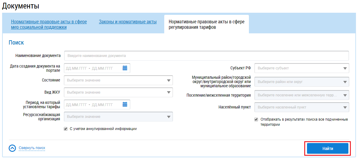 Поиск нормативных правовых актов в сфере регулирования тарифов