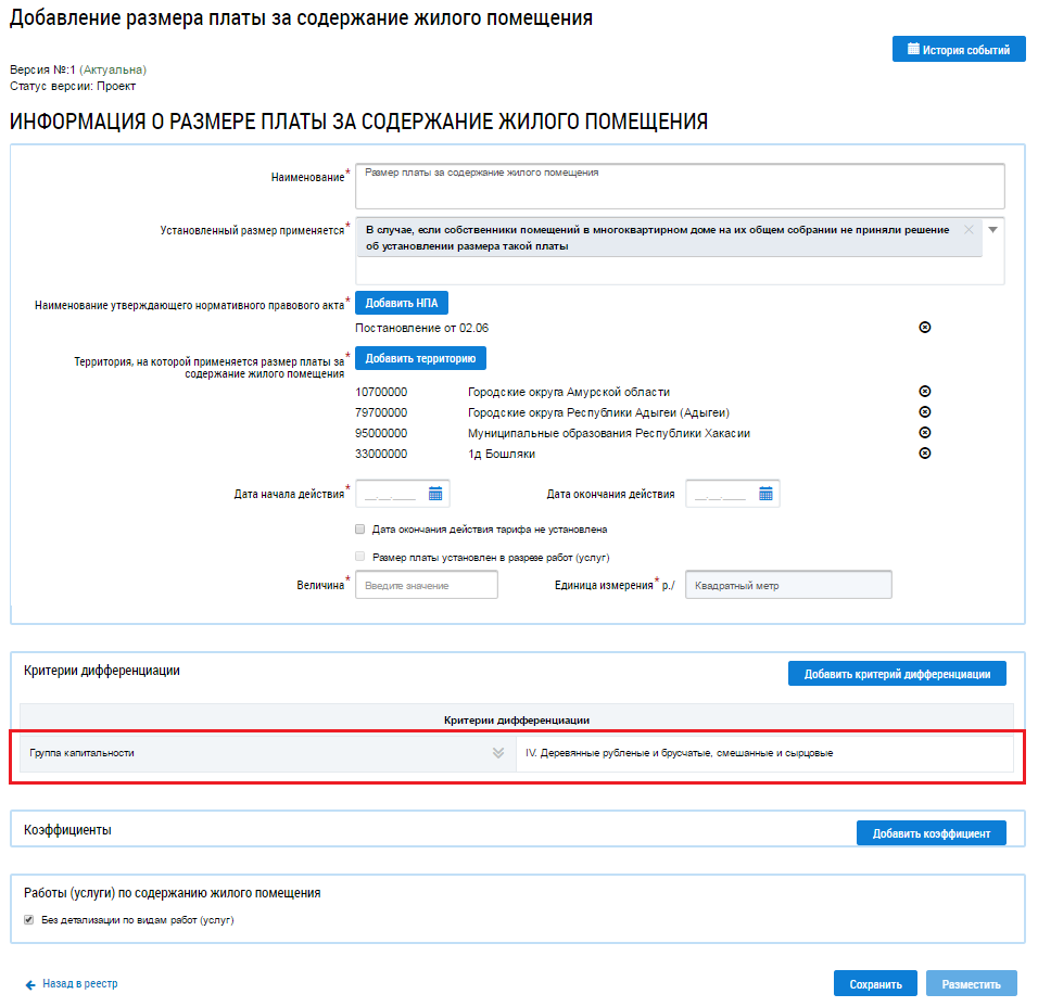 Выбранный критерий отобразится на странице Добавление размера платы за содержание жилого помещения.