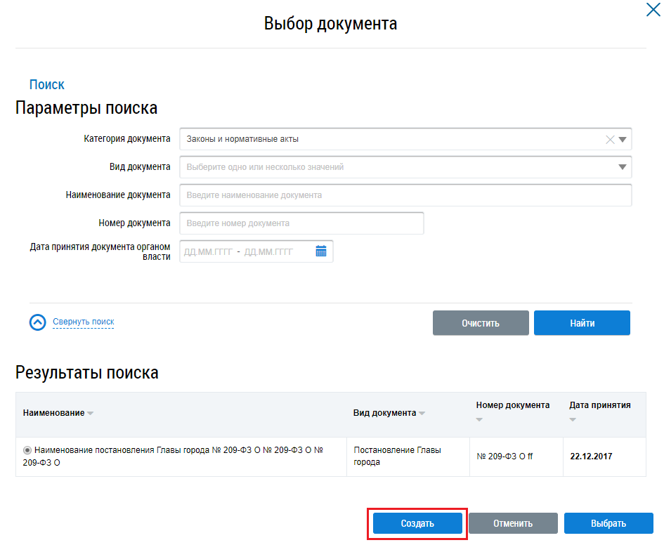 Для добавления утверждающего нормативного правового акта нажмите на кнопку Добавить НПА. Отображается окно Выбор документа.