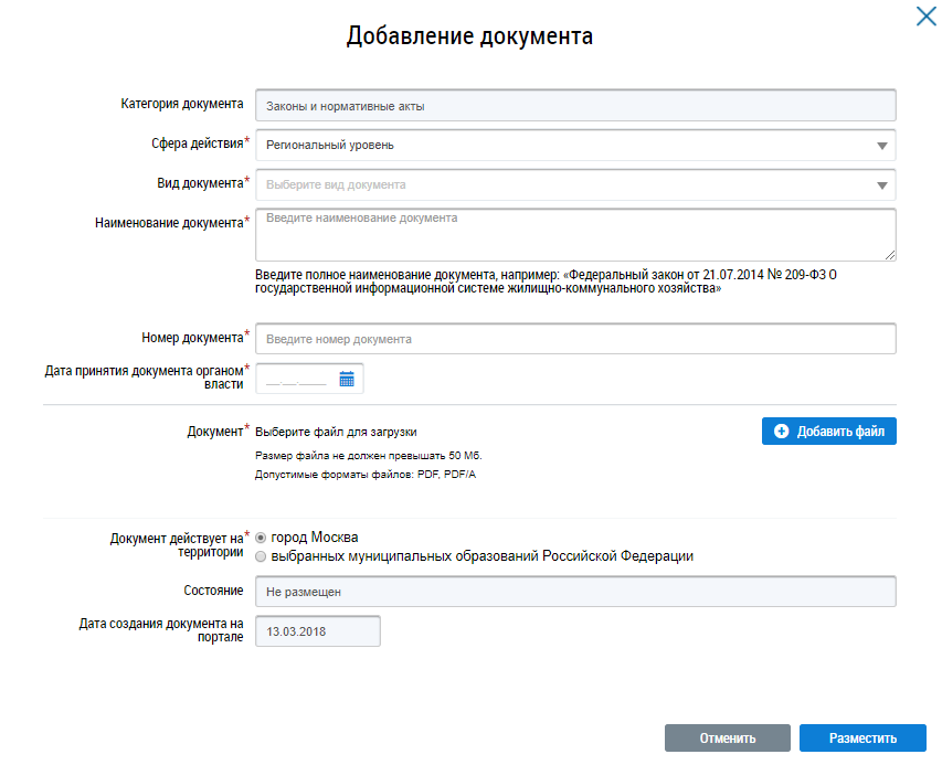 Заполните обязательные поля и нажмите на кнопку Разместить. Чтобы добавить территорию, на которой применяется размер платы за содержание жилого помещения нажмите на кнопку Добавить территория. Отображается окно Выбор муниципального образования или населенного пункта, входящего в состав муниципального образования.