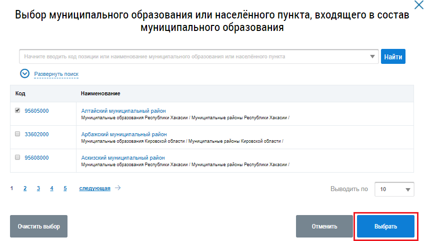 Воспользуйтесь блоком поиска. Ведите критерии поиска, начиная с поля Субъект РФ. Отображаются Результаты поиска. Установите переключатель в нужное положение и нажмите на кнопку Выбрать.