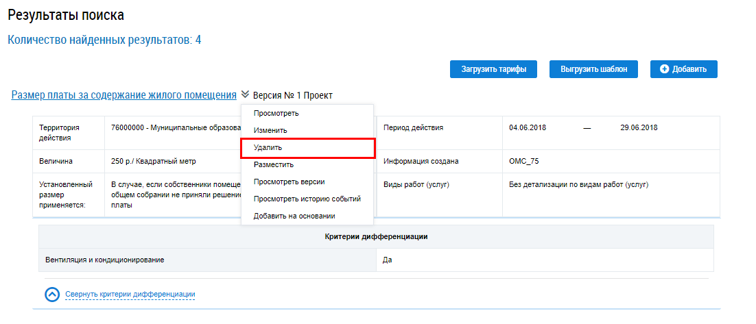 Для удаления информации о размере платы за содержание жилого помещения выберите пункт контекстного меню Удалить.