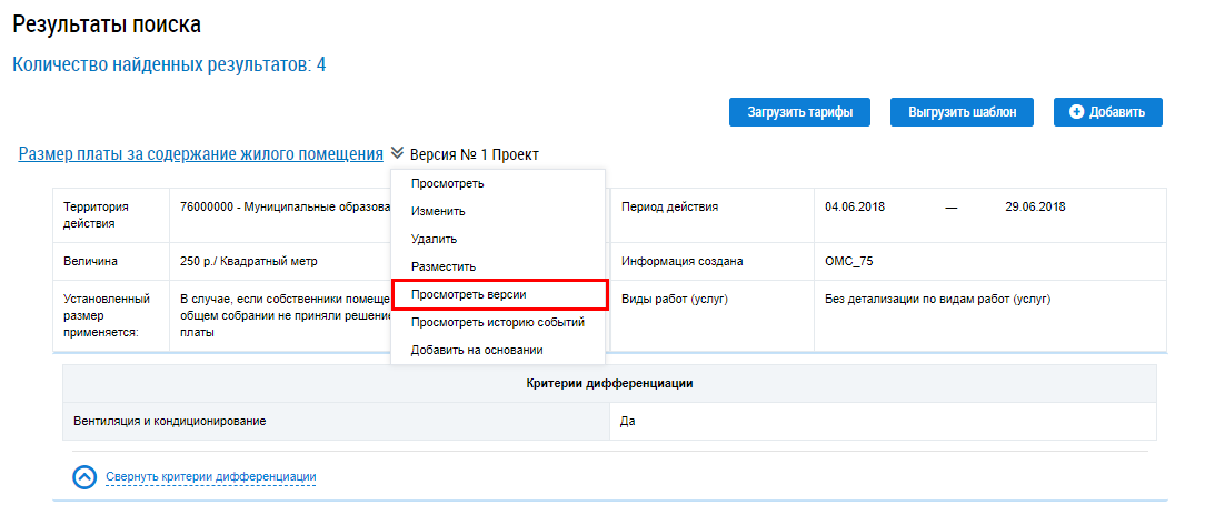 Для просмотра версий размера платы за содержание жилого помещения выберите пункт контекстного меню Просмотреть версии.