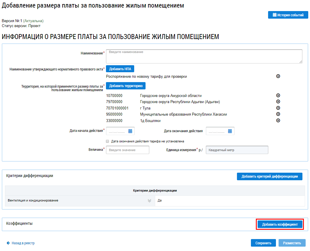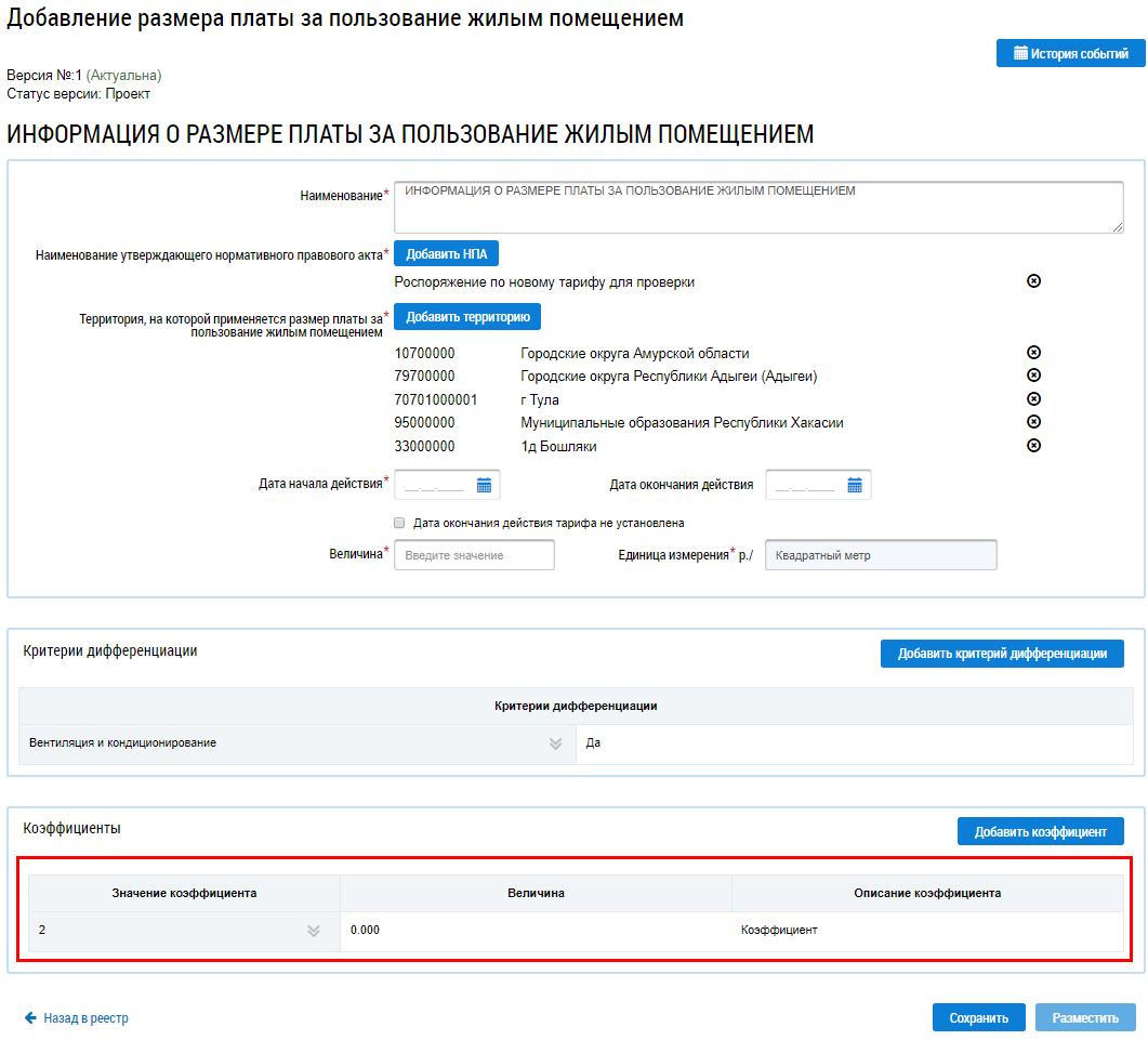 Коэффициент отобразится на странице Добавление размера платы за пользование жилым помещением.