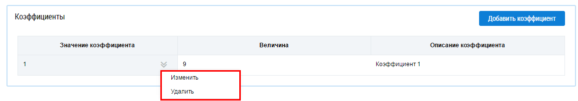 Для удаления коэффициента раскройте контекстное меню и выберите пункт Удалить.