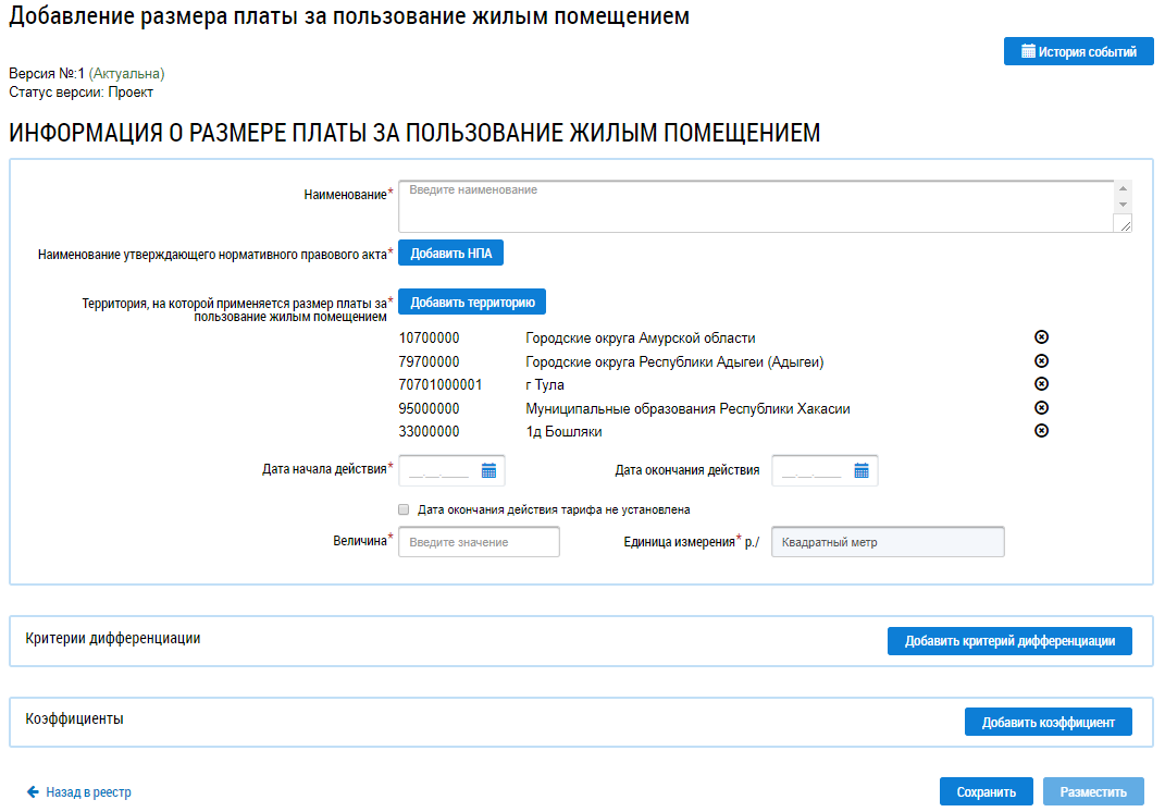 Чтобы добавить информацию о размере платы за пользование жилым помещением нажмите на кнопку Добавить. Отображается страница Добавление размера платы за пользование жилым помещением.