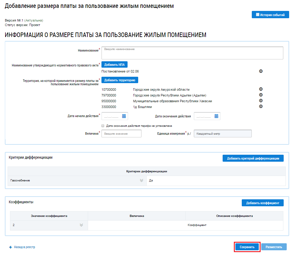 Для завершения процедуры создания информации о размере платы за пользование жилым помещением нажмите на кнопку Сохранить.