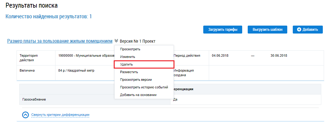 Для удаления сведений о размере платы за пользование жилым помещением выберите пункт контекстного меню Удалить.