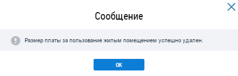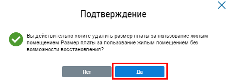 Подтвердите действия по удалению сведений о размере платы за пользование жилым помещением, нажав на кнопку Да. Отображается информационное сообщение об успешном удалении.