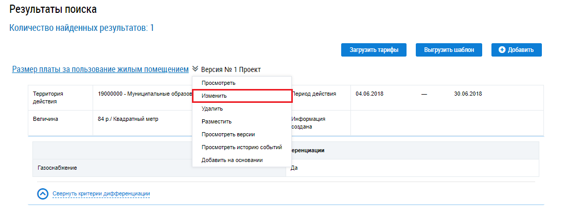 Для изменения информации о размере платы за пользование жилым помещением выберите пункт контекстного меню Изменить.