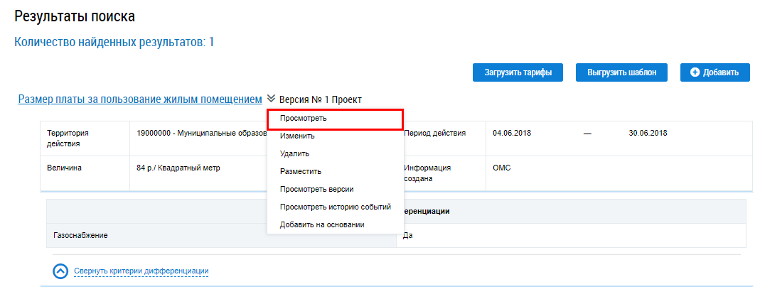 Для просмотра размера платы за пользование жилым помещением раскройте контекстное меню и выберите пункт Просмотреть.