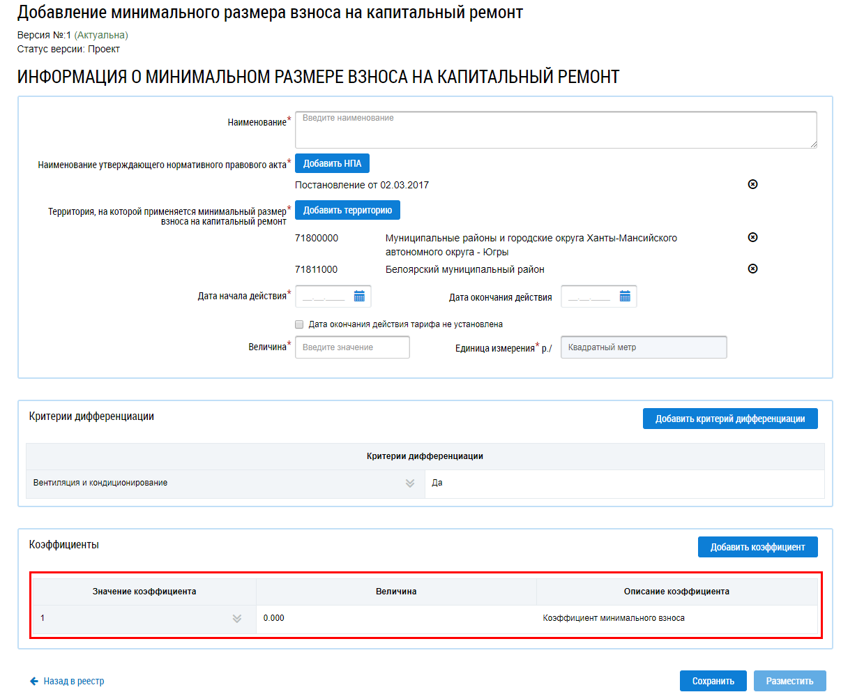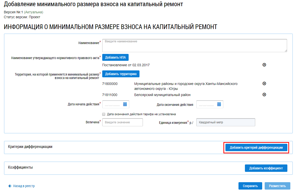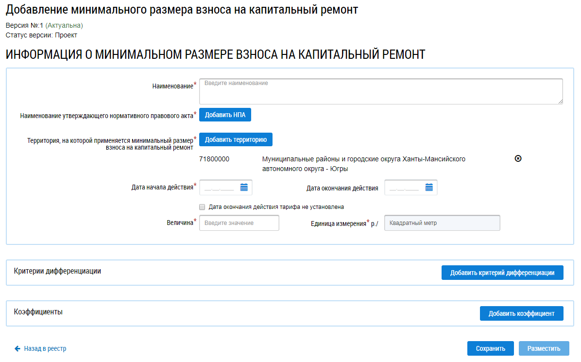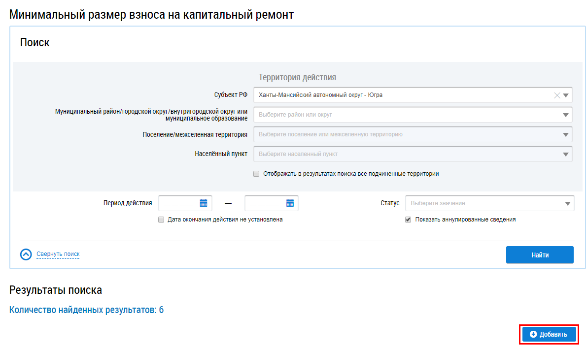 Для добавления информации о минимальном размере взноса на капитальный ремонт нажмите на кнопку Добавить.