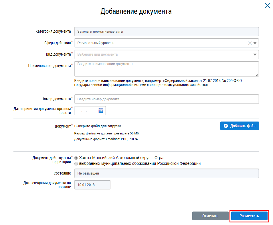 Воспользуйтесь блоком поиска, заполните поля и нажмите на кнопку Найти. Установите переключатель у необходимого наименования и нажмите на кнопку Выбрать. В случае отсутствия нормативного правового акта нажмите на кнопку Создать. Отображается окно Добавление документа.
